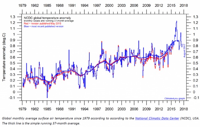 Abb. 4: Entwicklung der globalen Temperaturen gemäß früherer NCDC-Version aus dem Mai 2015 (rot) im Vergleich zum aktuellen NCDC-Datensatz (blau). Graphik: Climate4You.
