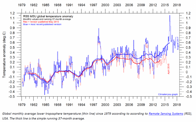 Abb. 5: Entwicklung der globalen Temperaturen gemäß früherer RSS-Version aus dem Mai 2015 (rot) im Vergleich zum aktuellen RSS-Datensatz (blau). Graphik: Climate4You.