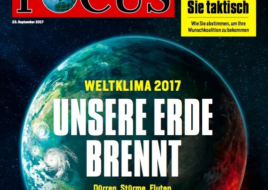 Unter den Printmedien war ausgerechnet der FOCUS diesmal die grüne Speerspitze. Er erschien unmittelbar vor der Wahl am 23. September 2017 mit einem reißerischen Artikel und der Aufforderung „So wählen Sie taktisch“. Auf der Titelseite prangte ein Satellitenfoto der Erde mit normaler Wolkenbedeckung im Nordwesten und einer feurig brodelnden Erde im Südosten. Auf dem Erdkreis stand folgender Text: „Weltklima 2017 – Unsere Erde brennt – Dürren, Stürme, Fluten – Was auf die Menschheit zukommt und wie sich das Leben verändern wird – Plus: Klima-Aktivist Al Gore im Interview“! Auf neun Seiten konnte man dann lesen „Wenn die Erde sich rächt…“