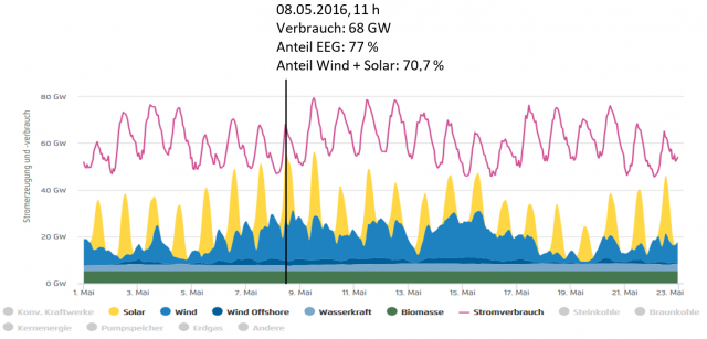 Die Neuen Energien lieferten (kurzzeitigst) einen erheblichen Anteil der Elektroenergie. Wie man auch sieht, allerdings mit extremer Einspeiseschwankung.