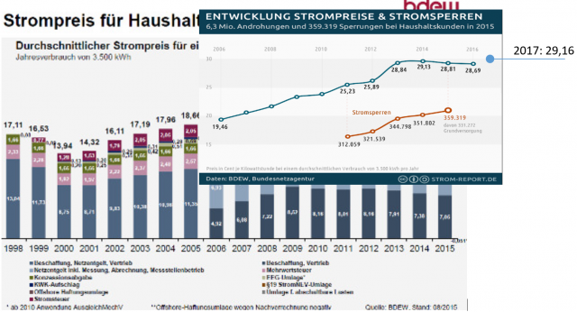 Bild 9 Entwicklung des Haushalts-Strompreises seit 1998 und Stromsperrungen seit 2011. Vom Autor aus zwei Quellen übereinandergelegt.
