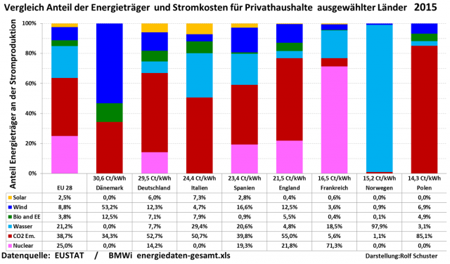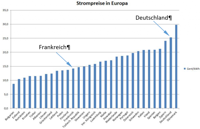 Damit hat Deutschland den zweithöchsten Strompreis für Privatkunden in Europa. Höher liegt er nur noch in Dänemark. Dieses bezeichnet sich auch als „Ökochampion“ [9] und hat bereits ca. 40 % Windenergie-Anteil. Allerdings liegt Dänemark wesentlich windreicher als das deutsche Inland und müsste demnach vom überall gemeldeten, billigen Windstrom überproportional profitieren.