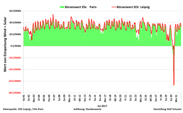 Immer, wenn durch die bedingungslose EEG-Einspeisung Überangebot herrscht, fällt der Börsenstrompreis und wird sogar negativ, da der Überschussstrom nicht gespeichert werden kann und somit entsorgt werden muss. Würde man es nicht machen, brächen die Netze zusammen. Die Entsorger – in der Regel das Ausland – bekommen dann noch Geld für das Abnehmen des Stromes.
