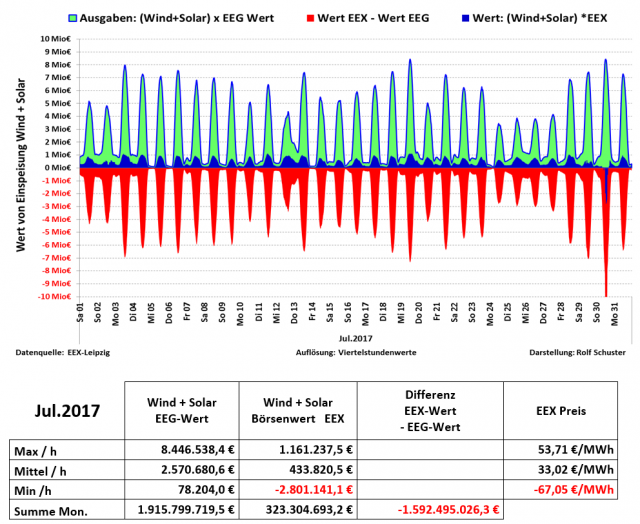 Um welche Summen es sich dabei handelt, ist Im folgenden Bild beispielhaft für den Juli 2017 dargestellt. Die Differenz von EEG-Zwangs-Vergütung und Börsenpreis betrug alleine in diesem Monat ca. 1,6 Milliarden EUR, selbstverständlich vom privaten Stromkunden zu bezahlen.
