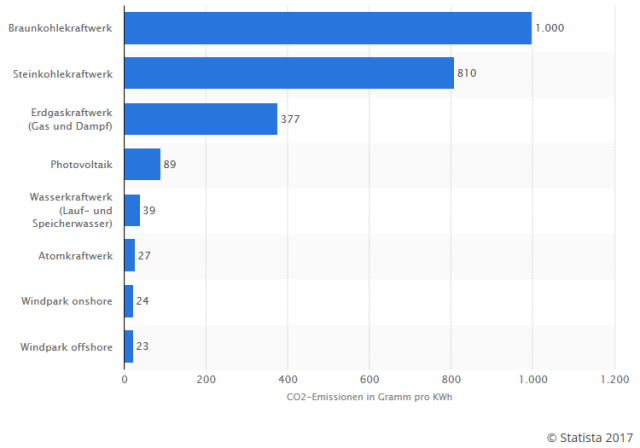 Die Angaben in Bild 16 sind irreführend. Während die CO2-Emission für Windkraft korrekt aus den Investitions- und laufenden Betriebskosten berechnet wurde – Wind ist ja gratis – und einen Wert von 24g CO2/kWh Windstrom ergibt, ist die CO2-Emission für ein Kohlekraftwerk aus der unmittelbaren Emission bei der Stromherstellung abgeleitet. Es werden hier Äpfel mit Birnen verglichen. Die unmittelbare CO2-Emission des Kohlestroms ist hier nicht relevant. Sie muss in den gesamten Herstellungsprozess einbezogen werden. Führt man korrekterweise die gleiche betriebswirtschaftliche Rechnung für Kohlestrom durch und geht von Herstellkosten für Kohlestrom in Höhe von 3 Ct/kWh aus, so ergibt sich für Kohlestrom eine CO2-Emission in Höhe von 10gCO2/kWh. Sie liegt damit bei etwa einem Drittel der CO2-Emission des Windstroms. Die von Statista vorgelegte Rechnung ist eindeutig falsch und gibt den Protagonisten der Energiewende Wasser auf die Mühlen. Die zugehörige Erklärung findet man unter http://www.kosten-energie-aequivalenzgesetz.com.