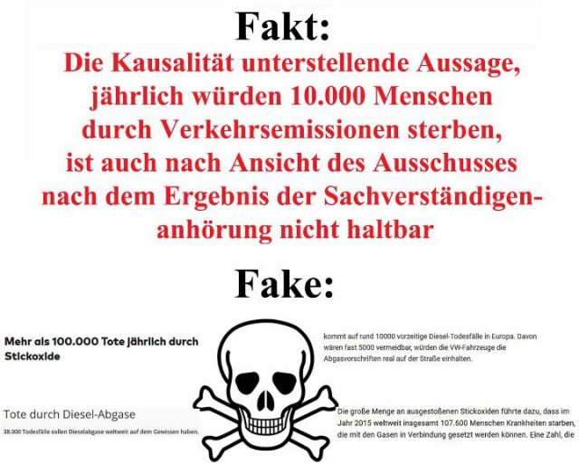– Die Kausalität unterstellende Aussage, jährlich würden 10.000 Menschen durch Verkehrsemissionen sterben, ist auch nach Ansicht des Ausschusses nach dem Ergebnis der Sachverständigenanhörung nicht haltbar.