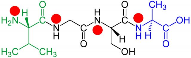 Bild 3. Alle Proteine des Körpers enthalten Stickstoff, der über natürliche Kreisläufe via NO2-Bildung in der Atmosphäre über die Pflanzen aufgenommen wird. In dieser Strukturformel des Proteinbausteins Tetrapeptid sind die vier Stickstoffatome durch rote Punkte hervorgehoben (Grafik: Wikipedia, Jü)