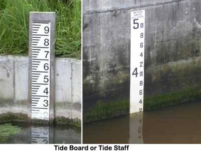 Es gibt mehrere offiziell etablierte Zustände der Tide (welche einfach die numerischen mittleren relativen Wasserstände für jeden Zustand sind). Diese nennt man tidal datums und sind in Relation gesetzt zu einem Punkt auf dem Festland, normalerweise markiert durch ein in Fels oder Beton eingebettetes Schild, eine „bench mark”. Alle Gezeitenwerte für einen speziellen Tidenmesspunkt werden in Fuß über oder unter diesem Punkt gemessen. Hier folgt eine bench mark am Battery Park in New York, und ein Beispiel-Gezeitenwert für Mayport in Florida (repräsentativ für die Stadt Jacksonville, welche jüngst durch den Hurrikan Irma überflutet worden ist):