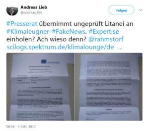 Die Indizien auf dem Twitter-Account von Andreas Lieb sprechen für die These, dass Andreas Lieb auch einer der beiden Beschwerdeführer der Presseratsbeschwerde gewesen ist, da die Fotos der beiden Antwortseiten des Presserates auch in seinem Twitter-Account hinterlegt sichtbar sind: