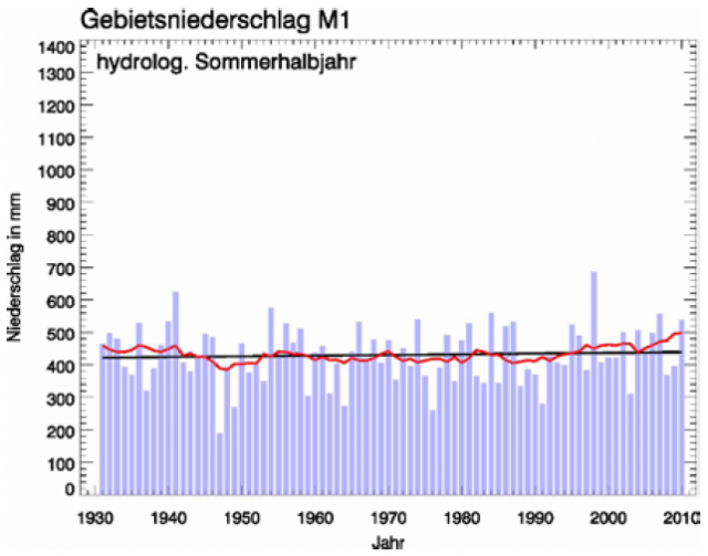Bild 2 Gebietsniederschlag Mainfranken Sommerhalbjahr 1930 – 2010. Quelle: KLIWA-Untersuchungsgebiet M1 „Main bis oh. Regnitz“.
