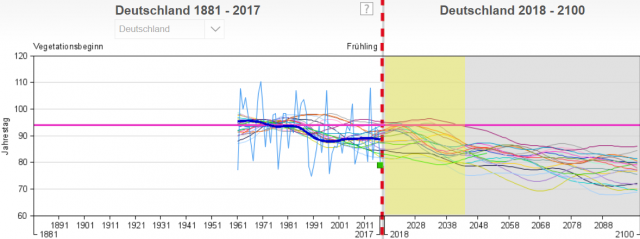 Die Möglichkeiten zur Aussage, welche Veränderungen auf den Obstanbau in Zukunft zukommen, sind also nur sehr schwer und zurzeit nur sehr begrenzt möglich. Das mittlere Blühdatum wird sich aber vermutlich bis zum bearbeiteten Zeitraum 2031-2060 im Verhältnis zu den letzten zwei Jahrzehnten nur noch wenig nach vorne verschieben. Bei der Gefahr von Spätfrösten zur Blüte ist für diesen Zeitraum im Vergleich zu den letzten 50 Jahren keine große Veränderung zu erkennen.