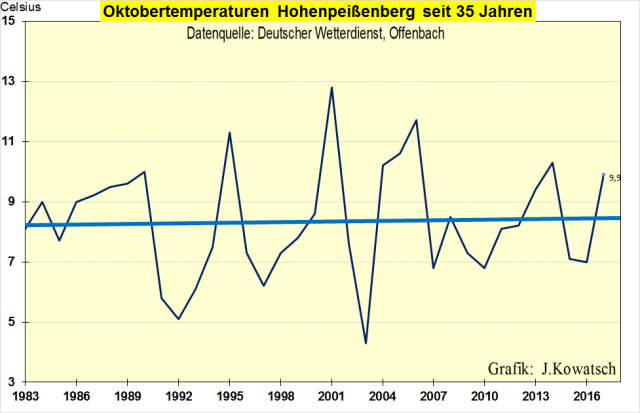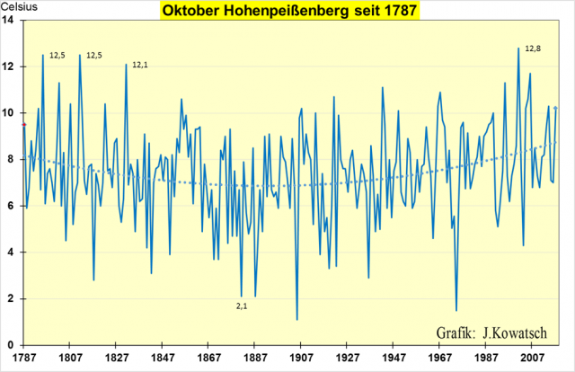 Wir stellen fest: Das Startjahr 1881 des DWD für seine Deutschlandbetrachtungen lag inmitten eines Kältetales. Der Hohenpeißenberg jedenfalls zeigt seit 1881 bis heute eine stetige und deutliche Erwärmung. Mit einem früheren Betrachtungsbeginn 1787 bis heute lediglich eine sehr moderate und keinesfalls beängstigende Erwärmung, wobei 2001 der wärmste Oktober war.
