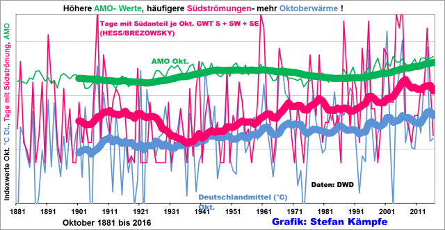 Von 1881 bis 2016 erwärmte sich der Oktober in Deutschland um fast 1,6 Kelvin (1 Kelvin = 1°C) und damit viel deutlicher, als der September. Zwei mögliche Erwärmungsursachen, eine leichte Häufigkeitszunahme der Großwetterlagen mit südlichem Strömungsanteil sowie die insgesamt gestiegenen AMO- Werte (ein Indexwert für die Wassertemperaturen im zentralen Nordatlantik), zeigt die folgende Grafik gleich mit. Eine dritte mögliche Ursache, die Verstädterung sowie die geänderte Landnutzung („Wärmeinseleffekte“ im weitesten Sinne) wurde hier bei EIKE schon oft erläutert und soll bloß erwähnt werden.