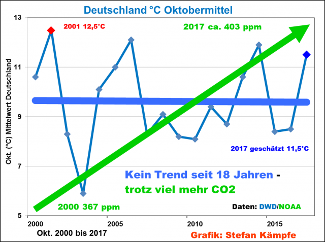 Abb. 4: Keine Oktobererwärmung in Deutschland seit 18 Jahren, und das trotz stetig steigender CO2- Konzentrationen. Zwar ist der 18- jährige Betrachtungszeitraum für endgültige Schlüsse zu kurz; trotzdem scheint es keinen Zusammenhang zwischen den Entwicklungen der CO2- Konzentrationen und der Lufttemperatur zu geben.