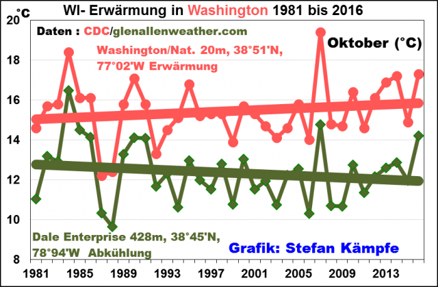 Andere wärmeinselarme, ländlich gelegene Messstationen zeigen übrigens ein ähnliches Verhalten: Die angenehme Oktobererwärmung seit 1881 ist auf dem Lande, das immerhin 85% der Fläche Deutschlands ausmacht, schon vor mehr als drei Jahrzehnten zu einem Ende gekommen. Seit 2000 haben wir bei vielen ländlichen Messstationen sinkende Temperaturen. Dem Leser nur zur Erinnerung: Auf dem Lande und in der freien Natur ist die CO2-Konzentration in den letzten 35 Jahren natürlich genauso gestiegen, wie in der Stadt. Gleicher CO2-Anstieg, aber stagnierende bzw. sinkende Temperaturen. Das passt nicht zusammen. Ein besonders schönes Beispiel findet sich in den USA, wo sich die Bundeshauptstadt Washington D.C. im Oktober seit 1981 erwärmte, das ländliche, auf gleicher geografischer Breite gut 100 Km weiter westlich gelegene Dale Enterprise aber abkühlte: