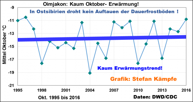 In Oimjakon (Ostsibirien) zeigt sich seit 1995 ein ähnliches Verhalten wie in Deutschland (fast Stagnation); freilich auf viel niedrigerem Niveau, denn im Indigirka- Hochtal herrscht im Oktober bereits strenger Dauerfrost: