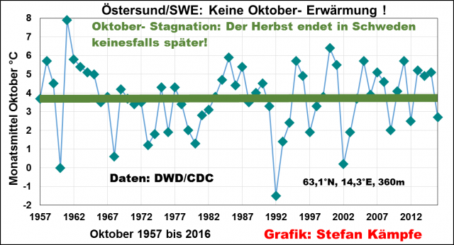 Und in Mittelschweden, wo im Oktober ähnliche Temperaturverhältnisse herrschen wie im deutschen November, stagnieren die Oktoberwerte bereits seit 60 Jahren: