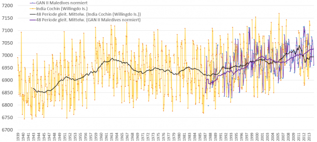 Bild 4 Verlauf Seepegel Malediven und gegenüber liegendes Festland von Indien. Daten Maledives gedehnt und im Offset angepasst. Grafik vom Autor anhand der PSMSL-Daten erstellt