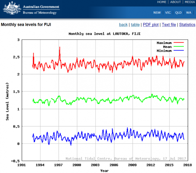 anbei die aktuellen Daten zum Pegelverlauf (Bild 11). Der Autor kann darin keinen stetig steigenden Pegel erkennen, wie er im Artikel von den Einheimischen berichtet wird. Er bleibt deshalb weiterhin dabei, dass die Ursachen der beschriebenen „Klimafluchten“ und der Probleme dieser Inseln nicht von einem (angeblichen) AGW-Klimawandel verursacht sind.