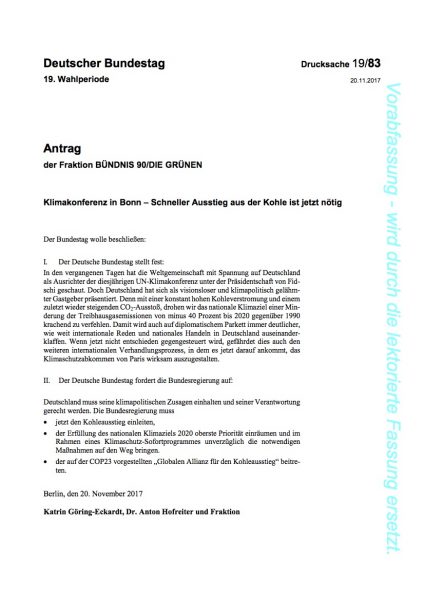 Antragstext der B90/Grünen vom 21.11.17 zum sofortigen Kohleausstieg. Zum Vergrößern anklicken