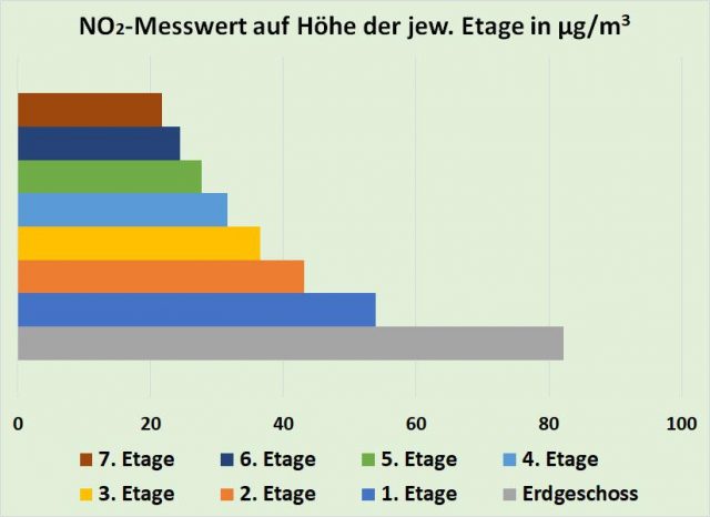 Bei der hier vorgestellten überschlägigen Kalkulation des von Grenzwertüberschreitungen betroffenen Anteils der Bevölkerung wurde ein weiterer wichtiger Aspekt noch ausgespart, obwohl er von erheblicher Bedeutung ist: Die Höhe der Wohnung über dem Erdboden. Obwohl die Häuser in den betroffenen Wohngebieten typischerweise eine fünf- oder sechsgeschossige Bauweise aufweisen, werden Immissionsmesswerte grundsätzlich nur auf Erdgeschossniveau erfasst. Dabei ist doch davon auszugehen, dass die schnelle Verdünnung, die man bereits in der Horizontalen mit zunehmender Entfernung von der Straße feststellen kann, sich auch nach oben hin zur freien Atmosphäre vollzieht. Den entsprechenden Beweis liefert Bild 7 [KOCH].