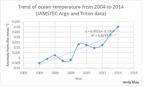 Die Temperatur der Ozeane steigt in der Tat. Aber globale Daten liegen erst seit dem Jahr 2004 vor und auch nur bis zu einer Tiefe von 2000 Metern. Die mittlere Tiefe der Ozeane beträgt aber 3688 Meter. Falls wir annehmen, dass die Temperatur in einer Tiefe von 3688 Metern etwa 0°C beträgt, was angesichts einer mittleren Temperatur in einer Tiefe von 2000 Metern von 2,4°C nicht unvernünftig ist, dann erleben wir gegenwärtig eine Erwärmung der Ozeane pro Jahr bis in diese Tiefe von 0,0031°C. Falls sich dies fortsetzt (das wird es nicht), würde es 1000 Jahre dauern, die Temperatur der Erde an der Oberfläche um 3°C steigen zu lassen, was kaum alarmierend ist. Mehr dazu hier.