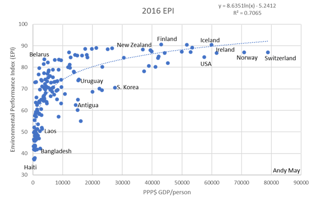 Abbildung 2 ist eine aktualisierte Version einer Abbildung in The Skeptical Environmentalist, wir haben die NASA-Messungen der Umweltqualität (EPI) für das Jahr 2016 geplottet im Vergleich zum BIP der meisten Länder in der Welt. Einige Länder sind namentlich genannt. Der Environmental Productivity Index (EPI) der NASA SEDAC ist auf der Y-Achse geplottet und das purchase-power-parity dollar (PPP$) BIP für jedes Land auf der X-Achse. Der Plot zeigt Punkte für 164 Länder, aus vielen Ländern standen keine Daten zur Verfügung, und Luxemburg wurde ausgenommen wegen des sehr hohen BIP pro Person von 102.831 Dollar, EPI = 86,6; das ist etwa das Gleiche wie in der Schweiz). Eine logarithmische Linie kleinster Quadrate durch die Daten zeigt eine Steigung von R² = 0,7; obwohl es viele andere Faktoren gibt, die bei allen geplotteten Ländern sowohl BIP als auch EPI beeinflussen. Allgemein hatte Lomborg in seinem Buch aus dem Jahr 2001 also recht: die wohlhabenderen Länder neigen dazu, eine höhere Umweltqualität aufzuweisen. Man kann sich davon auch überzeugen durch Betrachtung von Entwicklungsländern und entwickelten Ländern auf der ganzen Welt. Geht das BIP pro Person erst einmal über 2000 Dollar PPPS$ pro Person hinaus, wird es zu einem Faktor bzgl. Umweltqualität, bis es sich in den hohen Achtzigern verflacht bei etwa 50.000 PPS$ pro Person.