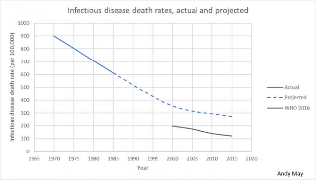 Die Behauptungen hinsichtlich zunehmender Infektionskrankheiten ist absolut falsch, wie man Abbildung 3 entnehmen kann. Infektionskrankheiten haben seit 1970 abgenommen, obwohl Beweise nur aus einigen Ländern vorliegen … Genauso kann man davon ausgehen, dass Infektionskrankheiten auch in Zukunft weiter zurückgehen, zumindest bis zum Jahr 2020. Selbst in absoluten Zahlen wird erwartet, dass die Anzahl von Todesfällen durch Infektionskrankheiten von 9,3 auf 6,5 Millionen sinken wird. – Lomborg, Bjørn. The Skeptical Environmentalist: Measuring the Real State of the World (S. 26).