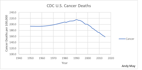 In Wirklichkeit ist die Todesrate durch Krebs von 1972 bis 1990 der CDC zufolge tatsächlich gestiegen, doch gab es nach 1990 einen dramatischen Rückgang, wie man in Abbildung 4 erkennt. Die in Abbildung 4 gezeigten Zahlen sind vom CDC altersangepasst: