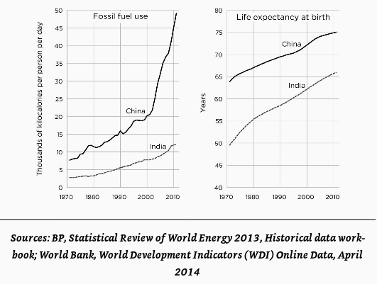 Insgesamt geht es der Menschheit heute weit besser als jemals zuvor. Mittels fossiler Treibstoffe, modernem Transportwesen und Kommunikations-Technologien haben wir ein weltweites Handelssystem errichtet, welches es gestattet, uns die Arbeit tausender Menschen auf der ganzen Welt zunutze zu machen. Dies hat Armut drastisch reduziert. Richtig ist auch, dass wohlhabendere Länder weniger Umweltverschmutzung haben mit saubererer Luft und saubererem Wasser als weniger entwickelte Länder. Das ist so, obwohl reichere Länder mehr fossile Treibstoffe verbrennen.