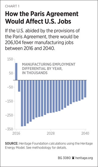 Falls die USA im Paris-Abkommen verblieben wären, wären die USA verpflichtet gewesen, ihre CO2-Emissionen bis zum Jahr 2025 um 26% bis 28% zu reduzieren im Vergleich mit dem Jahr 2005. Dies wäre nur mit den aktuell geltenden und zusätzlichen Vorschriften und/oder zusätzlichen Steuern zu erreichen gewesen. Schätzungen der Kosten der erforderlichen zusätzlichen Vorschriften einschließlich des – inzwischen annullierten – Clean Power Planes CPP variieren von 37 Milliarden Dollar (RFF) bis 250 Milliarden Dollar (NERA) an BIP-Verlust bis zum Jahr 2025. Schätzungen bzgl. des Verlustes von Arbeitsplätzen in der gesamten Ökonomie variieren von gar keine Verluste (REF) bis über 2,7 Millionen (NERA) bis zum Jahr 2025. Die höheren Verluste des BIP und von Arbeitsplätzen stammen aus einer Studie des NERA. Niedrigere Schätzungen stammen aus einem Artikel einer liberalen Denkfabrik namens „Resources for the Future” (RFF) von Chen and Hafstead, 2016. In beiden Studien wird eingeräumt, dass Vorschriften und Bemühungen im Jahre 2016 nicht ausreichten, um den Paris-Verpflichtungen gerecht zu werden. Die Heritage Foundation schätzt, dass den USA 206.104 Arbeitsplätze allein im produzierenden Gewerbe verloren gehen werden, siehe Abbildung 2: