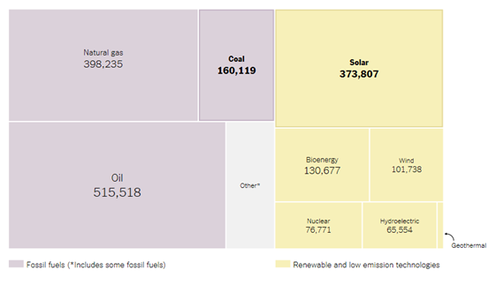 Die New York Times liebt es zu sagen, dass in der Erzeugung von Solarenergie mehr Menschen arbeiten als in der Kohleindustrie. Das klingt großartig – bis man erkennt, dass der EIA zufolge nur 0,9% unseres Stromes durch Solar erzeugt worden sind mit 373.807 Menschen, während Kohle 30% unseres Stromes erzeugte mit 160.119 Menschen. Zunahme von Produktivität ist dort, wo unser Lebensstandard herkommt, und die Hinwendung zu Solar geht in die falsche Richtung. Es wird offenbar, dass die NYT ignorant ist hinsichtlich grundlegender ökonomischer Prinzipien. Man betrachte die Graphik der NYT in Abbildung 3. Was dies bedeutet, ist: man braucht 83 Solar-Arbeitskräfte, um die gleiche Menge Strom zu erzeugen wie eine Arbeitskraft mit Kohlestrom. Das ist nur dann ökonomisch sinnvoll, falls die Solar-Arbeiter nur 1,2% des Lohnes eines Kohle-Arbeiters erhalten.