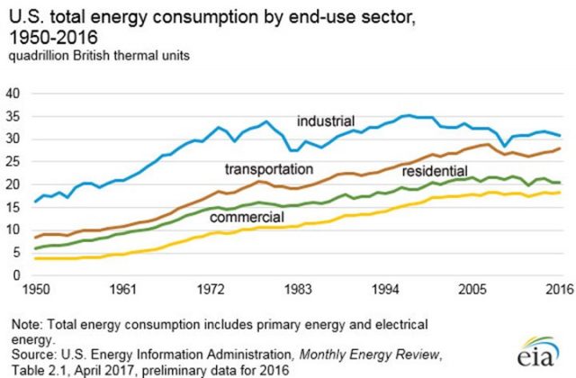 Der Weltenergieverbrauch steigt weiter. Sogar in den USA nimmt der Gesamt-Energieverbrauch zu, siehe Abbildung 4. Geräte, Häuser und Autos sind heute effizienter denn je, aber wir verbrauchen Energie auch zum Betrieb sehr viel anderer Dinge.