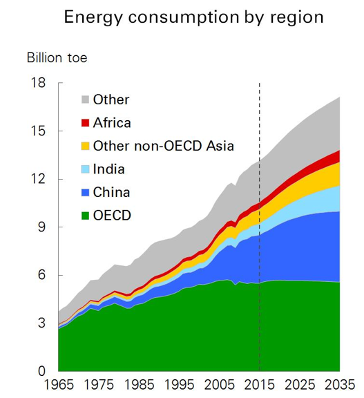 Dem BP-Energy Outlook für das Jahr 2017 zufolge hat sich die Gesamtmenge der verbrauchten Energie seit dem Jahr 1965 vervierfacht und wird als weiter zunehmend projiziert, siehe Abbildung 5: