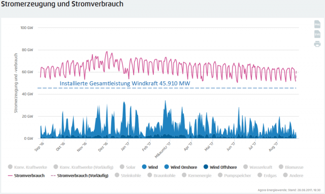 Zuerst die Erzeugung der Windkraft gesamt im Verhältnis zum aktuellen Verbrauch im Jahr 2016: