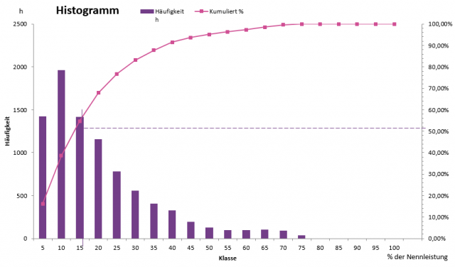 – über 59 Tage des Jahres (16,2 % vom Jahr) zwischen 0 … 5 % der Anschlussleistung ein.