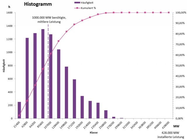 Die Frage, ob windarme Zeiten mit dieser Installation überbrückt werden können, ist nur eine Seite des Problems. Genauso wichtig ist die Frage, wohin mit den 342 GWh Wind- und Sonnenstrom, die ja bei gute Bedingungen auch anfallen, wenn ich maximal 70 GWh Verbrauch habe? Können Sie sich eine Speichertechnologie vorstellen, die 270 GWh Strom einspeichern kann? Und was diese Speichertechnologie (alles ist auf dem Papier möglich) dann zusätzlich zu dem ganzen Wind- und Sonnengedöns und den ganzen Leitungen kosten soll?