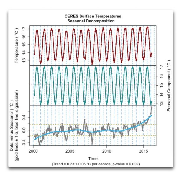 Abbildung 1: Rohdaten, jahreszeitliche Änderungen und Anomalie des CERES-Temperaturdatensatzes. Man beachte den Aufwärtstrend am Ende aufgrund des jüngsten El Nino. Seitdem ist es wieder kälter geworden, aber die CERES-Daten sind seit Februar 2016 nicht mehr aktualisiert worden.