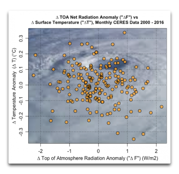 Abbildung 2: Änderungen der Strahlung an der TOA (Antrieb) ∆F vs. Änderungen der Temperatur am Boden ∆T. Delta (∆) ist das Standardsymbol für „Änderung“. In diesem Falle sind das die Änderungen von Monat zu Monat. Der Hintergrund ist ein Hurrikan aus Satellitenperspektive. Diesen habe ich hinzugefügt, weil ich des ewigen alten Weiß‘ überdrüssig bin.