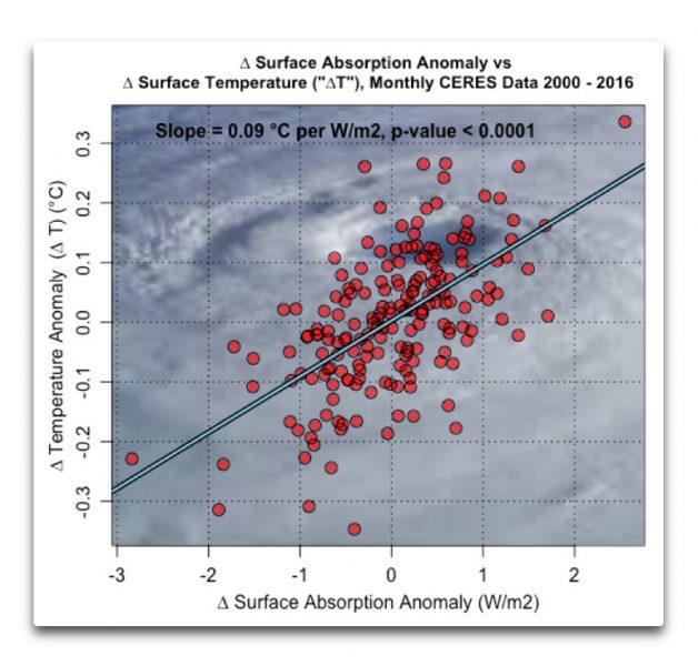 Man beachte, dass ich hier NICHT behaupte, dass man mit diesem Verfahren die so genannte „Klimasensitivität“ berechnen kann. Vielmehr weise ich lediglich darauf hin, dass die CERES-Daten nicht die erwartete Relation zwischen Änderungen des Strahlungs-Ungleichgewichtes an der TOA und Änderungen der Temperatur an der Erdoberfläche zeigen.