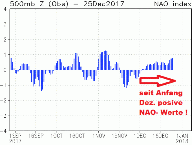 Ein Blick auf die Entwicklung der NAO (Nordatlantische Oszillation, ein Maß für das Luftdruckgefälle zwischen Azoren und Island) zeigt, dass sich im Dezember 2017 zunehmend positive NAO- Werte einstellten, was mildes Westwetter in Mitteleuropa begünstigt und uns das alljährliche „Weihnachtstauwetter“ beschert hat: