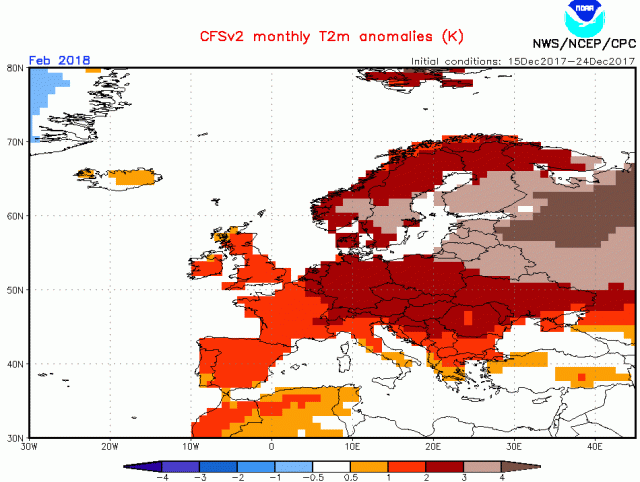 Abb. 2a und 2b: Momentan sieht das wichtigste Langfristmodell, das CFSv2 des US-Wetterdienstes NOAA, einen extrem milden Januar (oben) und einen sehr milden Februar vorher. Zur Beachtung: Diese Prognosen sind experimenteller Art und keinesfalls stets zutreffend; doch momentan erwarten alle Institute, IRI, DWD, MeteoSchweiz und UKMO, einen milden Hochwinter 2018.