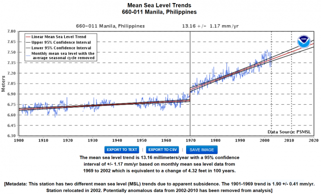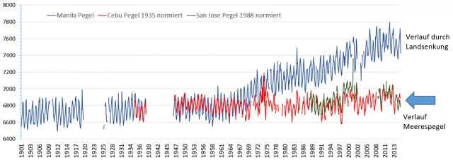 Dazu muss man wissen, dass die NOAA-Tidenpegel immer ohne isostatische Korrekturen, also als reine Messwerte angegeben sind. Manila versinkt durch seine Bevölkerungszunahme und die damit einhergehende, exzessive Wasserentnahme buchstäblich im schlammigen Untergrund.