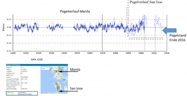 Bild 4 Pegeldarstellung Manila der NOAA vom Autor mit dem Pegelverlauf SAN JOSE bis zum Jahr 2016 ergänzt.