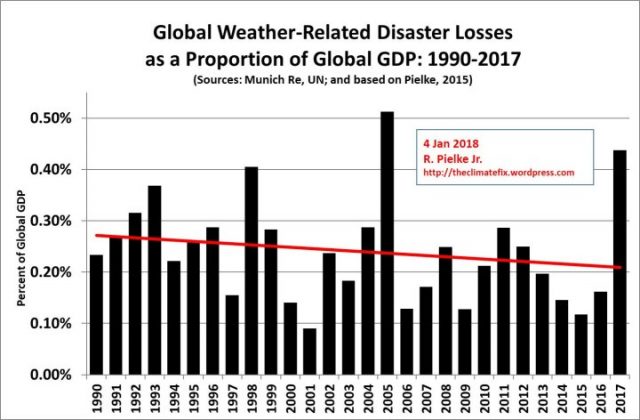 Abbildung: Jährliche Kosten von Wetterkatastrophen (Daten von der Münchner Rück) im Verhältnis zum globalen BIP (Daten von den UN) von 1990 bis 2017.
