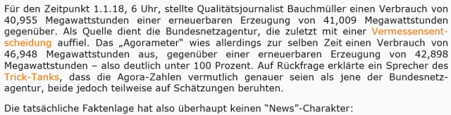 Süddeutsche Zeitung 4. Januar 2018: [1] … Als es endlich soweit ist, liegt fast ganz Deutschland friedlich in den Federn. Es merkt auch keiner nach dem Aufstehen. Kein Wecker blinkt, weil zwischenzeitlich der Strom ausgefallen ist. Dabei hat sich Deutschland gerade zum ersten Mal in der Geschichte komplett mit Ökostrom versorgt: am Neujahrsmorgen um sechs Uhr.
