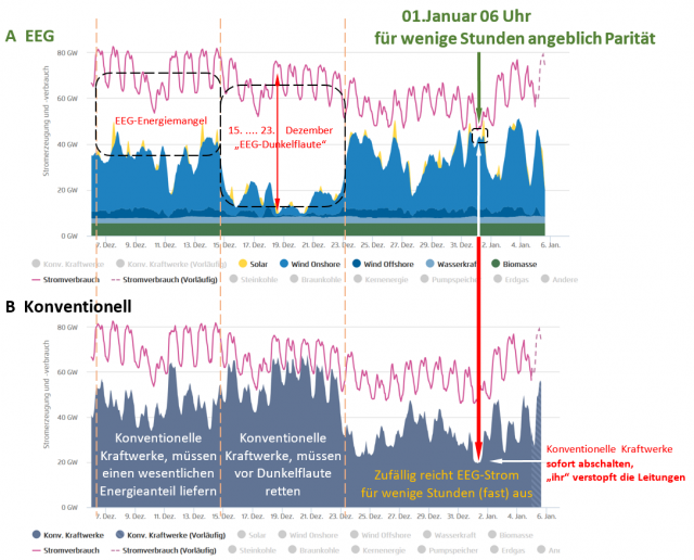 Sofort sieht man, dass den (vielleicht – eher jedoch nicht) wenigen Stunden „EEG-Planerfüllung“, ausschließlich Zeiten gegenüberstehen, in welchen – so man sich auf das EEG verlassen müsste – eklatanter Energiemangel herrscht, welcher bis zur praktisch vollständigen Energiedunkelheit über eine ganze Woche reicht (A: 15. … 23. Dezember).