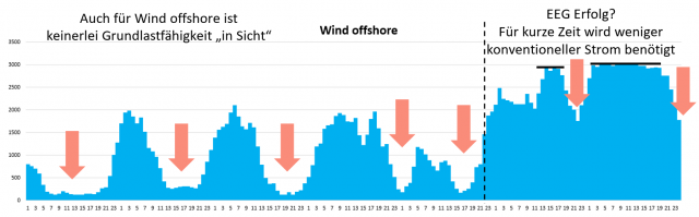 Wie es das folgende Bild 3 zeigt, gilt dies auch für Wind offshore, der angeblich Grundlastfähigkeiten besitzen soll, wie es „Experten“ – die ja keine Fachpersonen sein müssen – regelmäßig versichern: