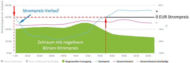 Bild 4 Neujahrstag mit Verlauf der negativen Stromkosten (blaue Linie) von ca. 00 …. 14 h an der Strombörse