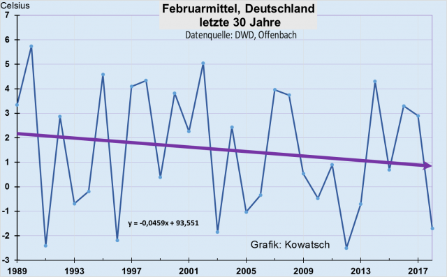 Grafik 4: Der Monat Februar wurde in den letzten 30 Jahren deutlich kälter in Deutschland, das zeigen die vom Deutschen Wetterdienst bzw. von den einzelnen Stationsleitern sorgfältigst erhobenen Temperaturdaten. Die Februarabkühlung beträgt nahezu 1,5 Grad. Allerdings sind die Daten nicht wärmeinselbereinigt, sonst wäre die Trendlinie noch fallender.
